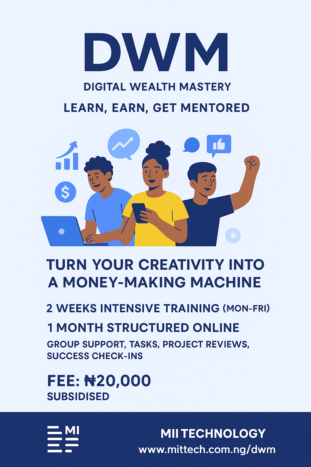 Turn your phone, laptop, and creativity into a money-making machine. Join our 2-week intensive training and build your path to financial freedom.